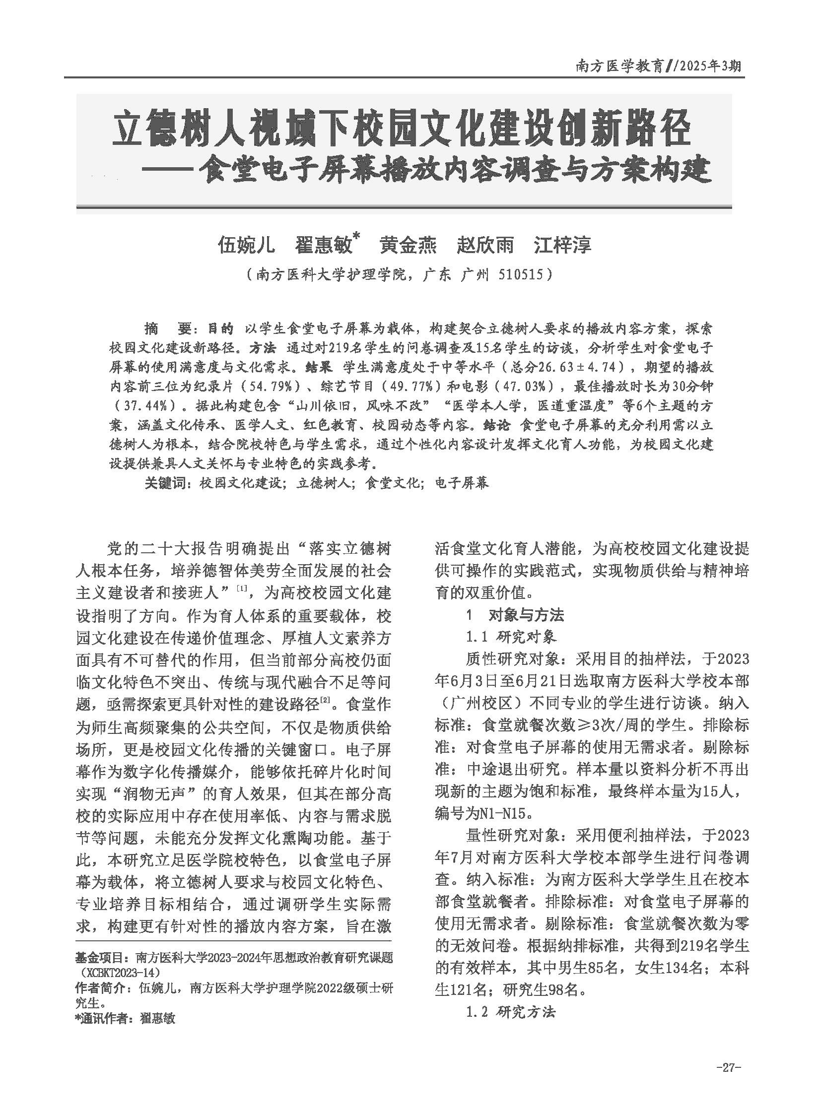 立德树人视域下校园文化建设创新路径——食堂电子屏幕播放内容调查与方案构建