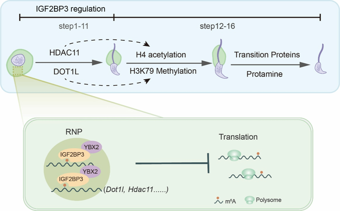 综上,该研究发现:在精子细胞中高表达的m6A识别蛋白IGF2BP3通过协同YBX2对关键mRNA(如Dot1l、Hdac11等)发挥翻译抑制的作用,以确保鱼精蛋白替换和精子成熟正确发生,为深入理解RNA m6A修饰在精子发育及雄性生殖中的生物学意义提供了新的理论依据。