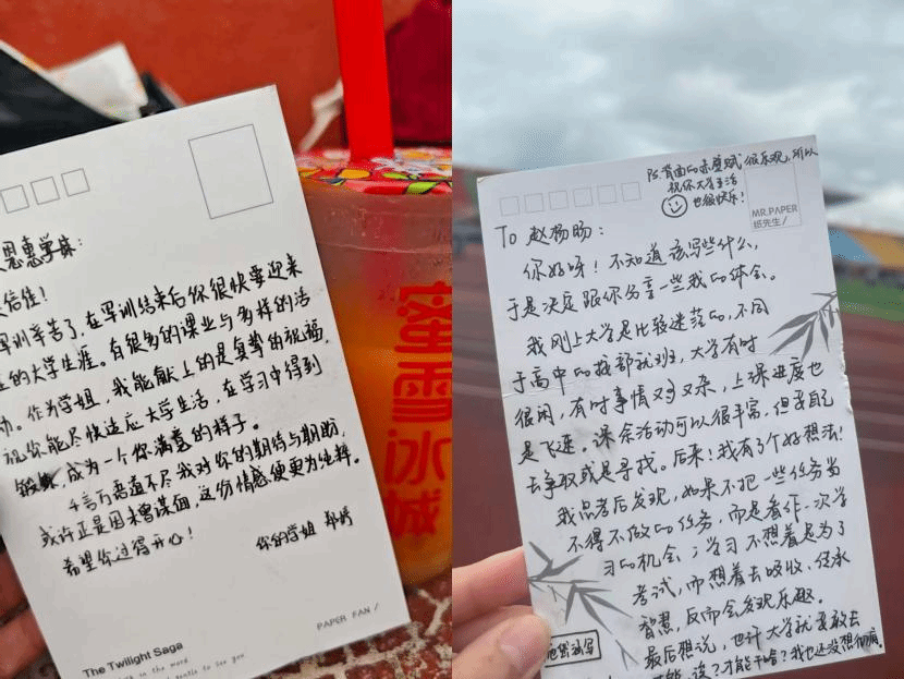 来自广州校区的2024级基础医学(院士创新班)的9位同学,专程前往顺德校区,看望正在军训的2025级新生。他们不仅带来了学院的问候,更准备了充满心意的解暑饮品与手写明信片。每一张明信片上,都写满了学长学姐的真挚祝福与殷切期望,字里行间流露出对新朋友们的鼓励与祝福。