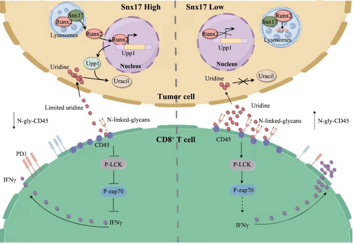 综上所述,该研究发现尿苷是一种可调节CD8+ T细胞活性的免疫代谢物,揭示了癌细胞通过降低肿瘤微环境中尿苷的水平,抑制抗肿瘤免疫的分子机制;SNX17可作为癌症免疫治疗耐药的预测性生物标志物,而尿苷或许是一种有前景的免疫治疗药物。