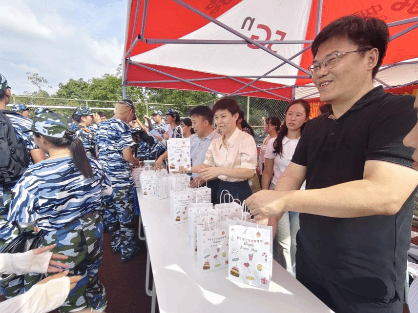 学院的领导和老师们亲自将精心准备的“清凉物资”送到新生手中。这份体贴入微的关怀,瞬间化解了训练的疲惫,笑容在每一位同学的脸上绽放。