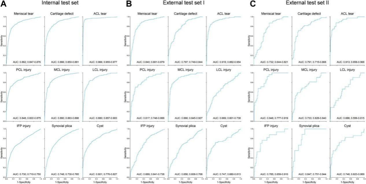 诊断性能方面,在内部测试集中,主要病变(半月板撕裂、软骨缺损、ACL撕裂)的AUC值达到0.898,外部测试集也保持0.852的高水平;九病种准确率内部测试集达到73.1%-95.6%,外部验证集63.3%-89.3%;临床辅助效果显著,辅助医师诊断后,整体准确率提升4.2%-8.8%。
