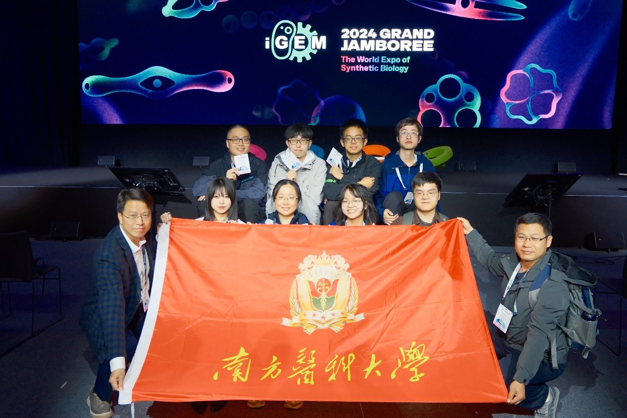 我校参赛团队共有18名学生,指导教师团队包括基础医学院李凌、第一临床医学院(南方医院)孙剑、第二临床医学院(珠江医院)何肖龙、基础医学院刘坤等。学生分别来自临床医学(八年制、五年制)、基础医学(院士创新班)、预防医学(卓越创新班、卫检班)、精神医学、生物信息学、生物医学材料等十多个专业。该项目于2024年1月组队,经过约10个月的努力,完成了实验研究、建模,制作了Wiki网页并进行展示,开展了社会实践(Human practices & Education)收集反馈意见建议优化项目,推广合成生物学理念,最终于10月24日在巴黎进行汇报答辩,全面展示了项目成果。该项目完全由学生从临床问题出发,自主选题、自主设计、自主实施完成,充分发挥了学生的主观能动性,激发了创新意识与创新精神。