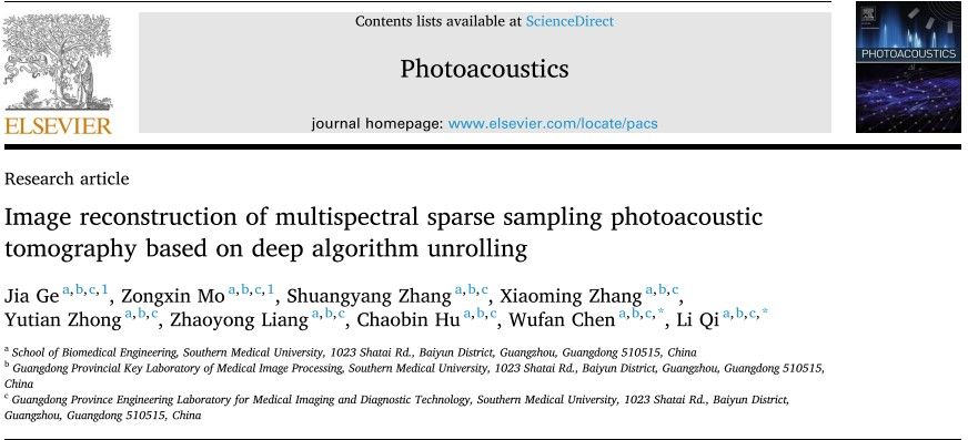 近日,生物医学工程学院陈武凡、戚力团队在稀疏光声层析成像图像重建的研究取得新进展,在中国科学院一区学术期刊《Photoacoustics》发表了最新科研成果:Image reconstruction of multispectral sparse sampling photoacoustic tomography based on deep algorithm unrolling.