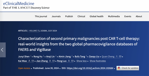 近日,珠江医院肿瘤科张健、罗鹏团队在Lancet系列杂志eClinicalMedicine在线发表题为“Characterization of second primary malignancies post CAR T-cell therapy: real-world insights from the two global pharmacovigilance databases of FAERS and VigiBase”的研究论文。