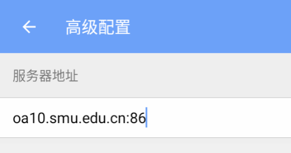 ②配置新办公OA服务器。第一次启动APP时需配置学校新办公OA服务器,点击右上角齿轮图形进入服务器配置。
