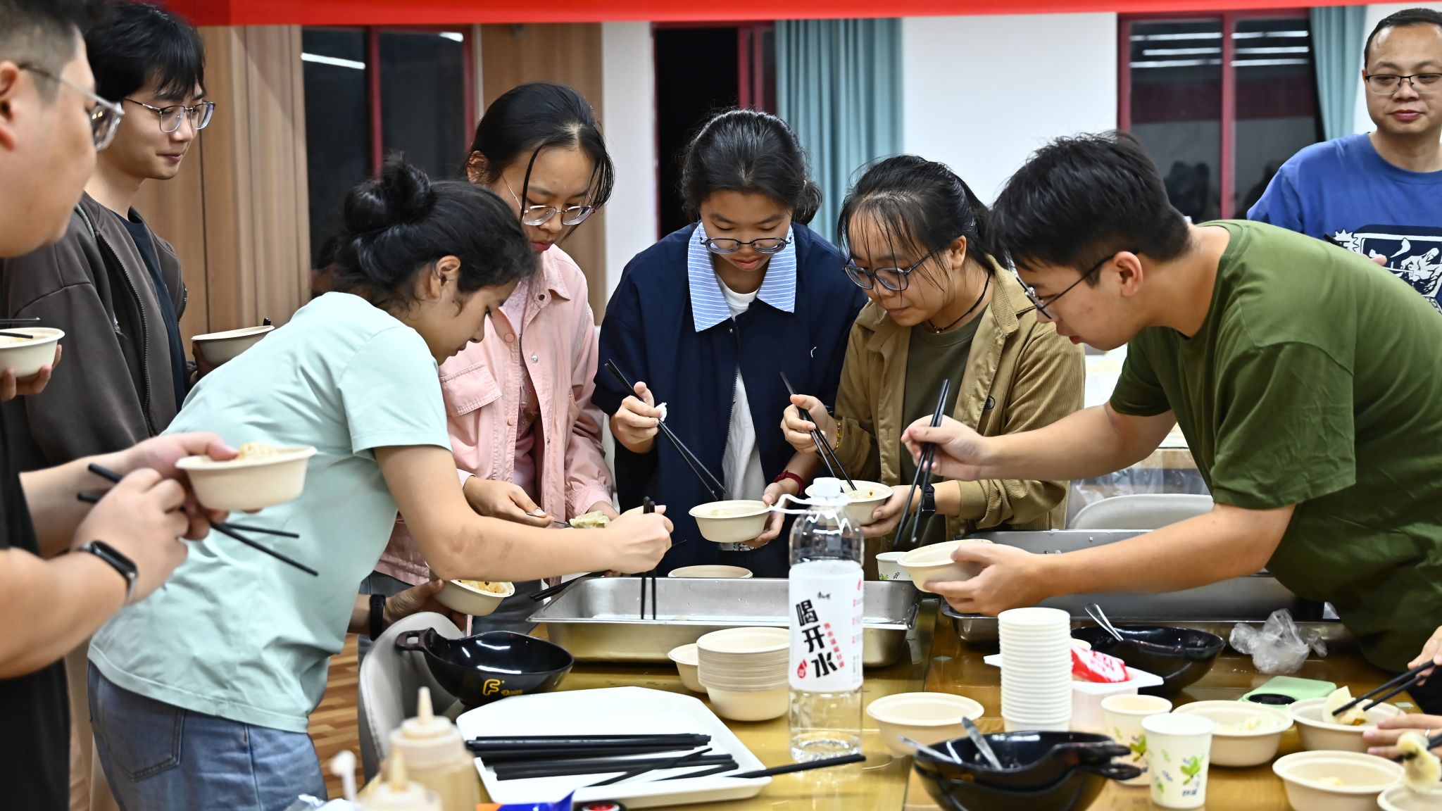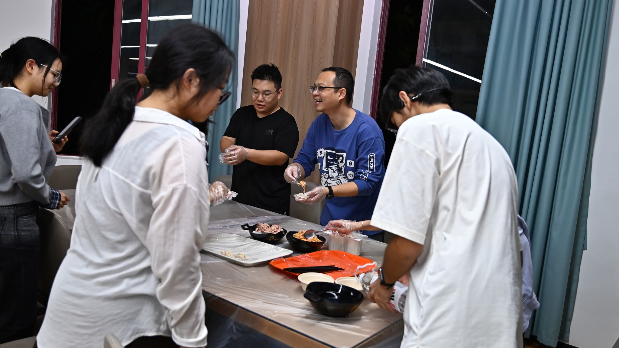 随着暮色降临,师生们陆续抵达。包饺子区域热闹起来,大家围坐桌前,形态各异的饺子在大家手中诞生,过程中不时传来调侃与欢笑,彼此切磋技艺、分享经验,陌生感在互动中悄然消融,温情在指尖流转。