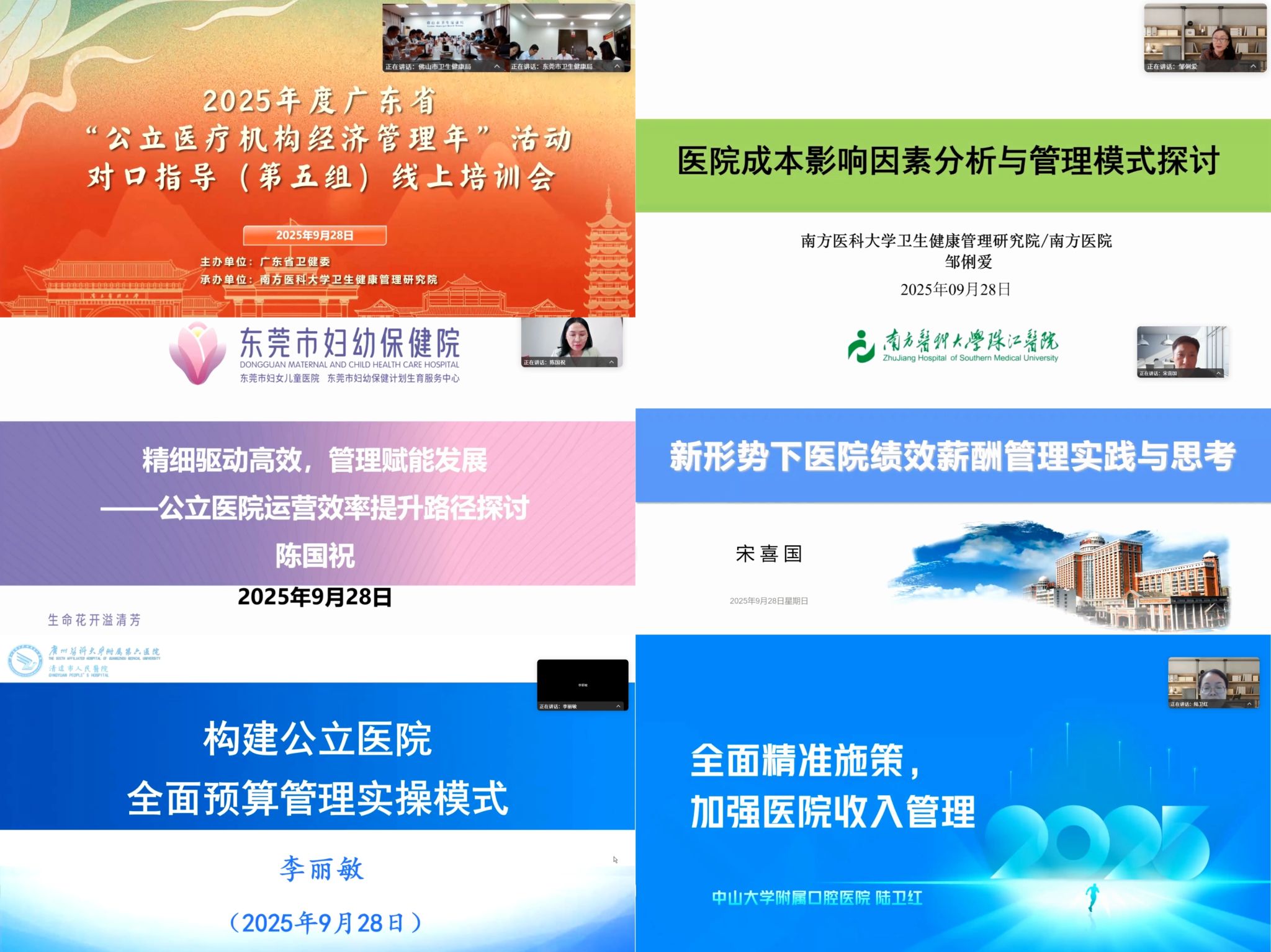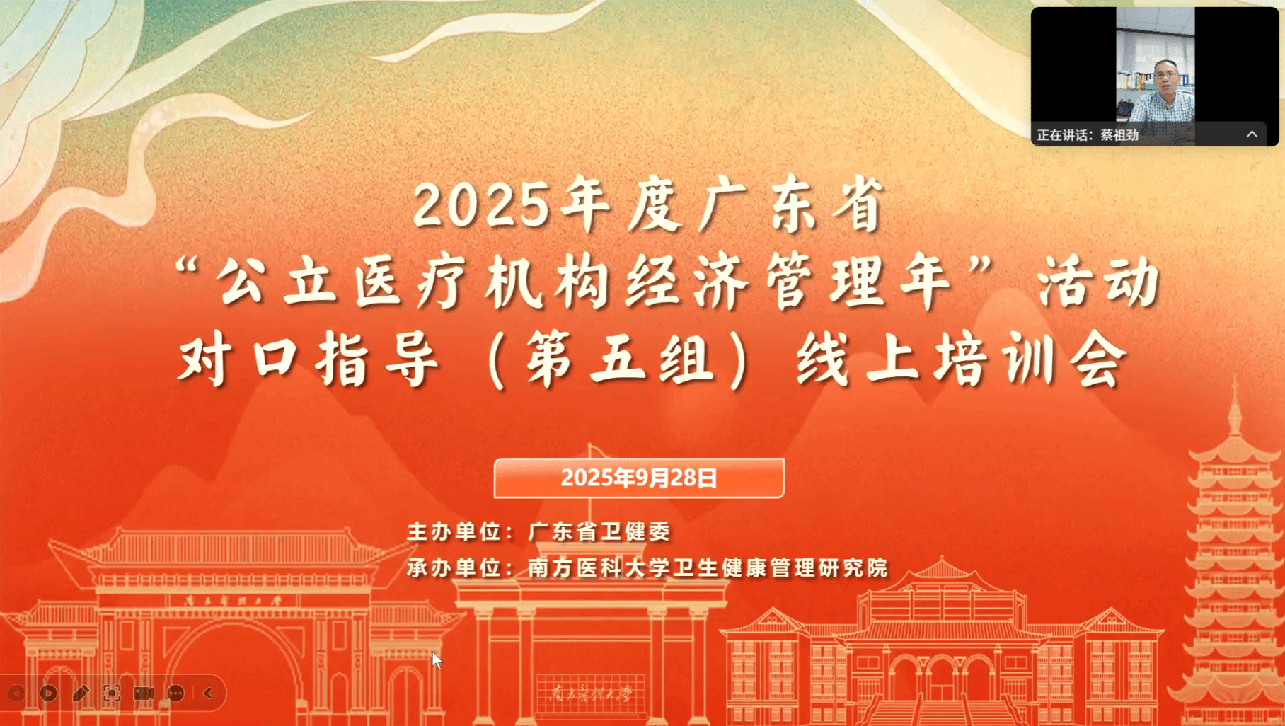 为贯彻落实《广东省2024—2025年持续开展“公立医疗机构经济管理年”活动实施方案的通知》《广东省卫生健康委办公室关于完善持续开展公立医疗机构经济管理年活动专家组对口指导工作机制的通知》等文件精神,持续推动公立医疗机构经济管理提质增效,广东省“公立医疗机构经济管理年”活动第五专家组于2025年9月28日下午针对小组负责的佛山、东莞两地的公立医疗机构召开线上培训会。