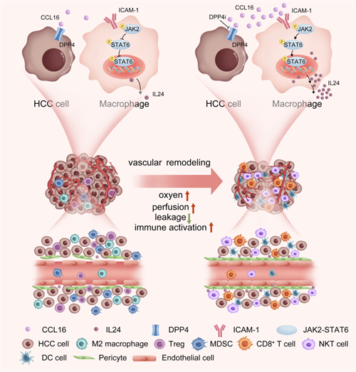 该研究首次阐明CCL16-ICAM1-JAK2/STAT6-IL24信号轴在肝癌血管免疫调控中的核心作用;发现DPP4抑制剂西格列汀可通过稳定CCL16促进血管正常化;提出"西格列汀+抗PD-1抗体"联合治疗新策略,为解决肝癌免疫治疗耐药提供新方向。研究成果在国际顶级肿瘤学期刊Cancer Research上在线发表,题为《Tumor-derived CCL16 Normalizes Tumor Vasculature through Macrophage ICAM-1 Receptor and Enhances Immunotherapy Efficacy in Hepatocellular Carcinoma》。珠江医院陈锟灵博士、广东省人民医院冯伙伦博士、南方医院张钰洁博士和珠江医院裴婧源硕士为共同第一作者。