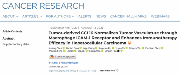 研究团队发现CCL16诱导肿瘤血管正常化增强肝癌免疫治疗新策略