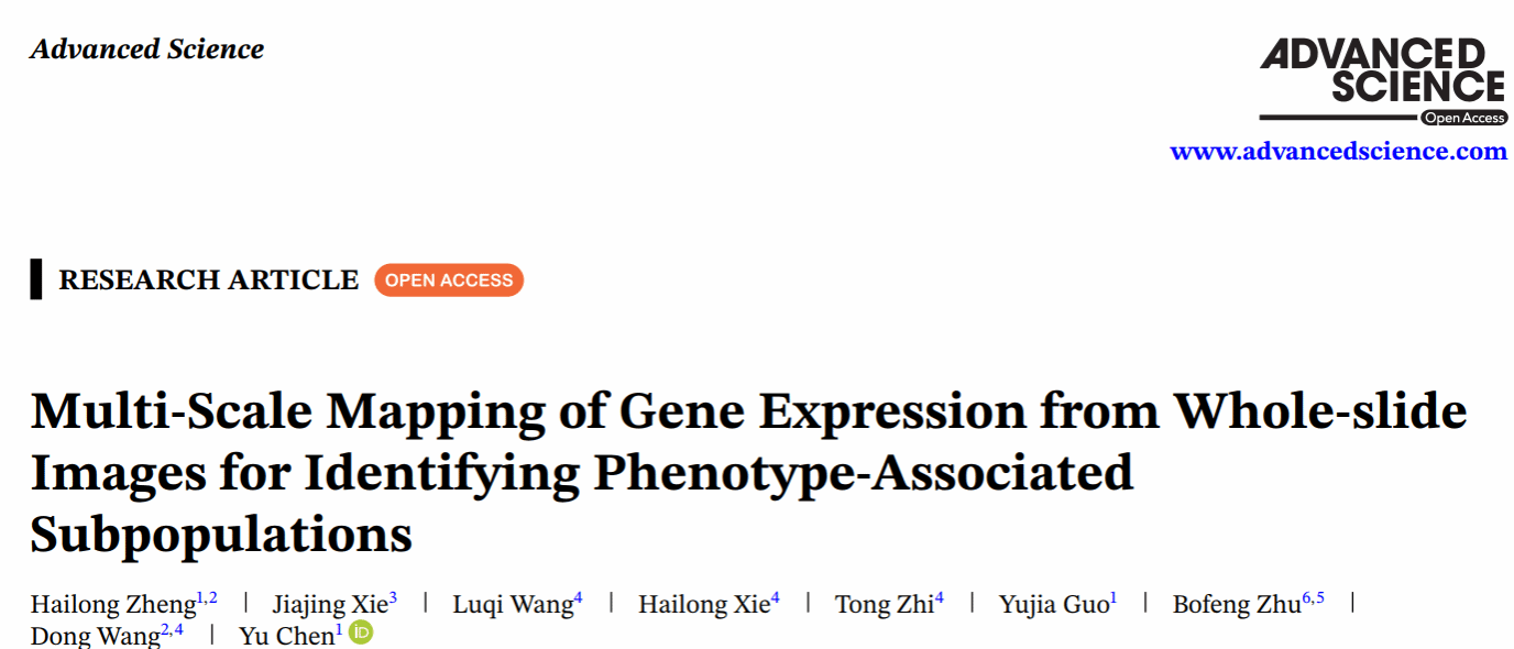 该研究成果发表于国际知名期刊《Advanced Science》,题为“Multi-Scale Mapping of Gene Expression from Whole-slide Images for Identifying Phenotype-Associated Subpopulations”。第七附属医院陈羽教授、王栋教授为通讯作者。该研究为利用常规病理图像评估肿瘤风险、识别关键分子特征和辅助精准治疗提供了新方法。随着后续研究的深入和临床验证的推进,该方法有望在肿瘤风险评估、关键分子特征识别和精准治疗辅助决策中发挥更大作用,进一步彰显第七附属医院在病理图像智能分析与临床转化研究中的特色优势。