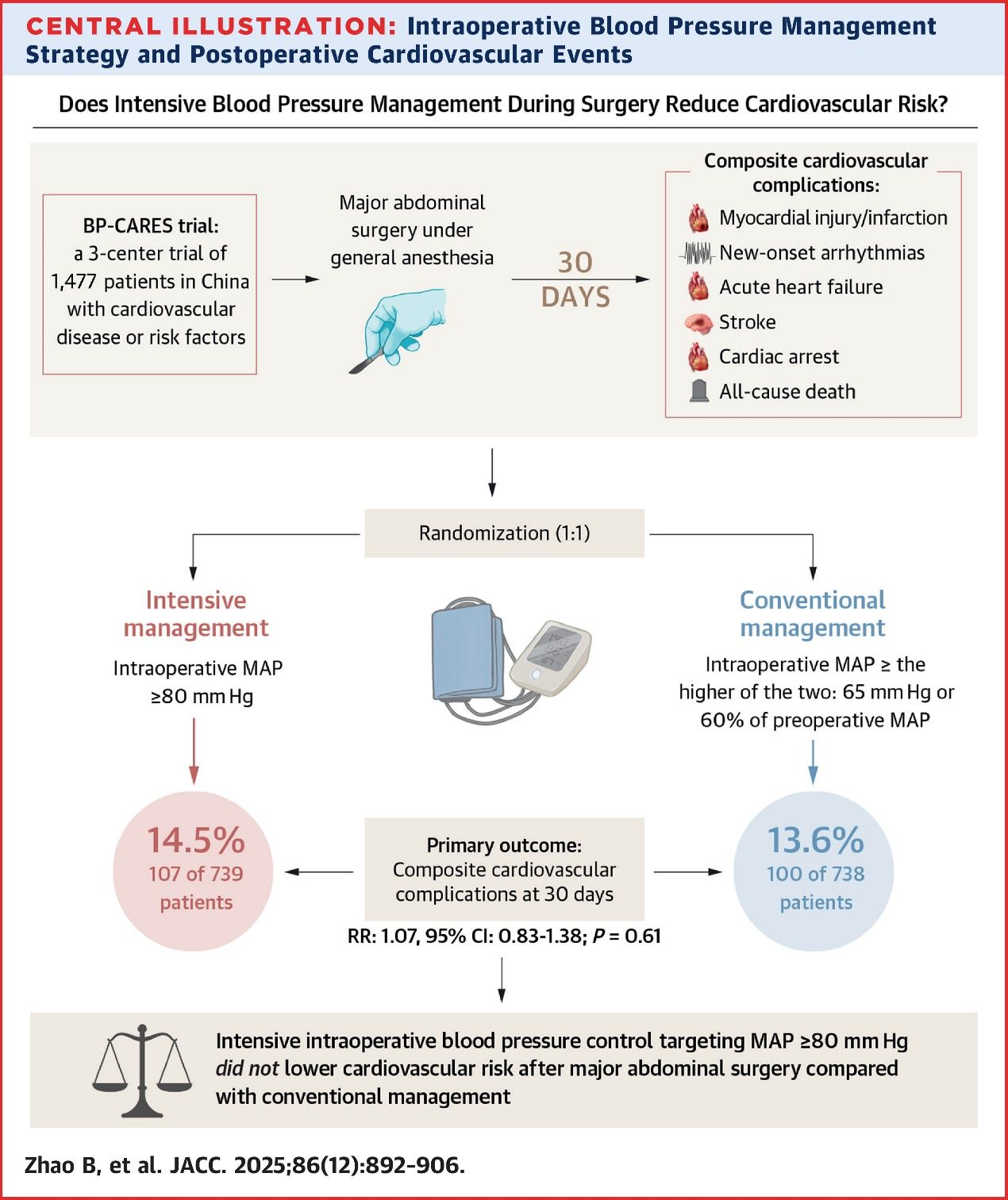 摘要:近日,南方医院麻醉科教授刘克玄、副研究员赵秉诚团队与合作者最新研究证实:平均动脉压≥65 mmHg可作为安全的术中血压管理标准。该研究聚焦心脑血管高风险患者非心脏手术的术中循环管理。此前大量观察性研究表明,术中低血压与术后心脑血管并发症紧密相关,但术中血压下降的危险阈值不明,且通过提升术中血压控制目标能否减少术后心脑血管事件存在争议。BP-CARES研究示意图,展示了相关研究的设计和主要结论。基于此,刘克玄、...